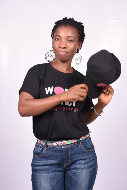 拿着黑色的帽子摆在白色背景前的黑色t恤和蓝色牛仔裤的女人的照片 · 免费素材图片