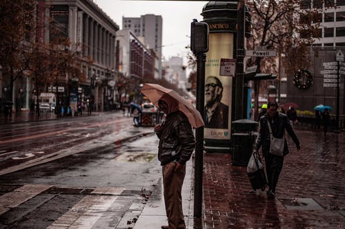 下雨时走在建筑物旁边的男子手持伞的照片 · 免费素材图片