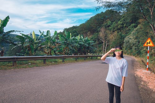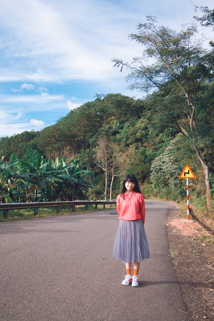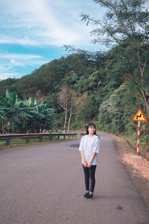 女人站在路上穿着粉红色和灰色连衣裙 · 免费素材图片