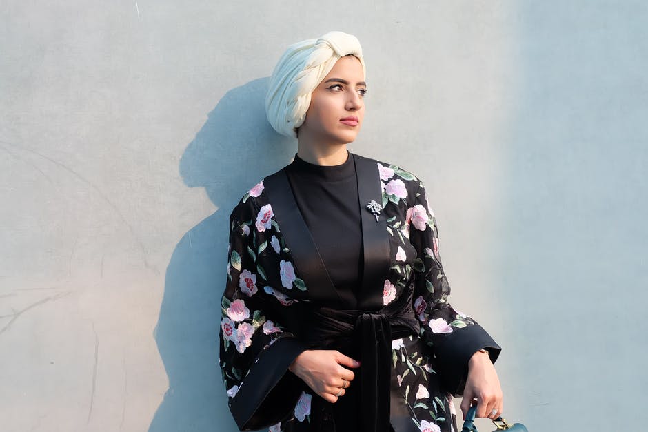 黑色和粉红色的花长袍,倚在墙上的女人 · 免费素材图片