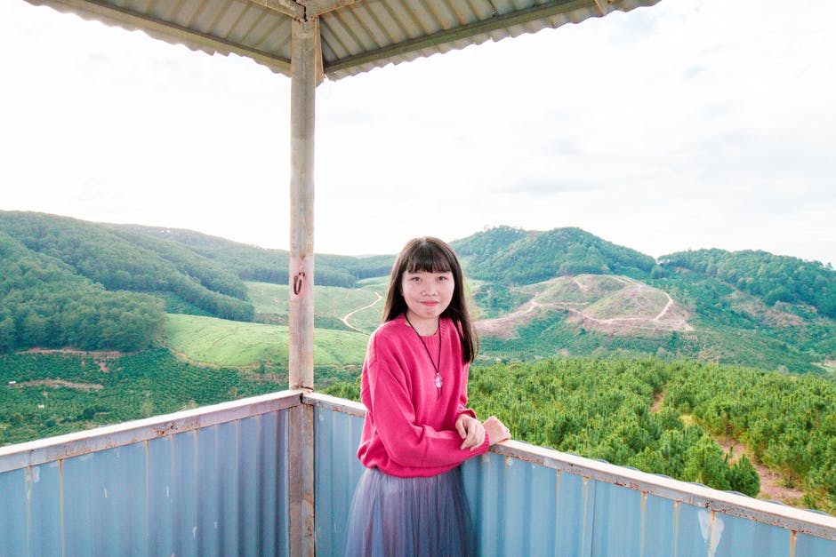站立在篱芭旁边的女孩在白云和蓝天下的山附近 · 免费素材图片