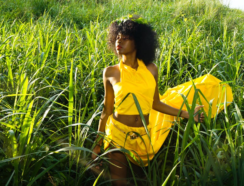 黄色礼服站立在高草的妇女 · 免费素材图片