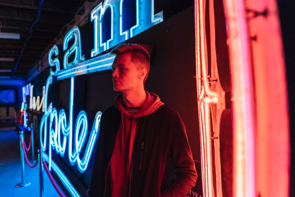 站在霓虹灯标牌附近的人的照片 · 免费素材图片