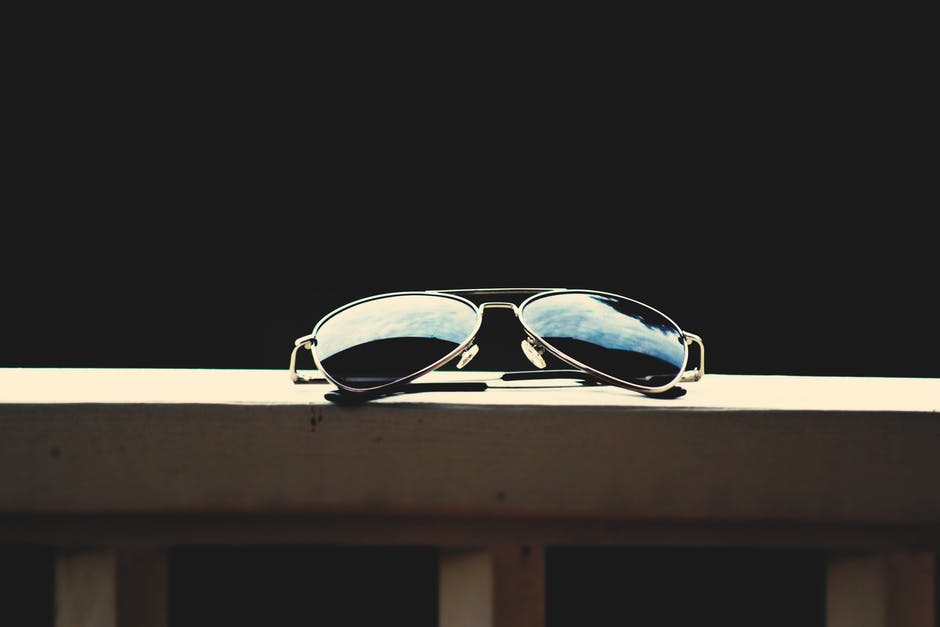黑色镜面飞行员式太阳镜,棕色木栏杆上带有灰色镜框 · 免费素材图片