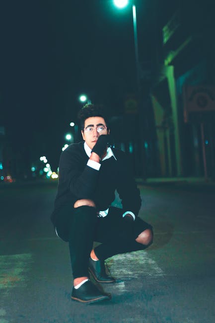 晚上在建筑物外的道路上蹲着的人 · 免费素材图片