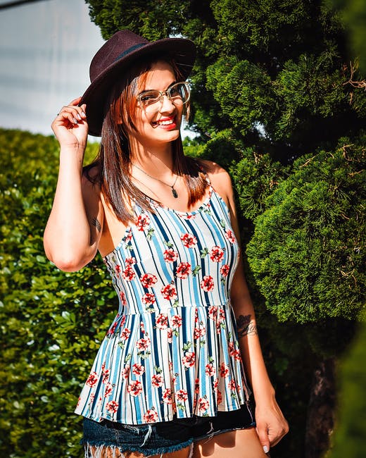 拿着她的棕色浅顶软呢帽帽子的妇女站立在绿色发辫前面 · 免费素材图片