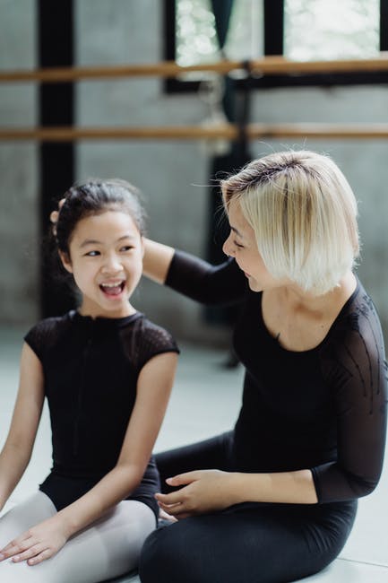 性格开朗的小亚洲芭蕾舞演员与教练在工作室的地板上休息 · 免费素材图片