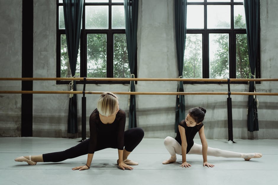 亚洲芭蕾舞女演员在宽敞的工作室在地板上伸展双腿 · 免费素材图片