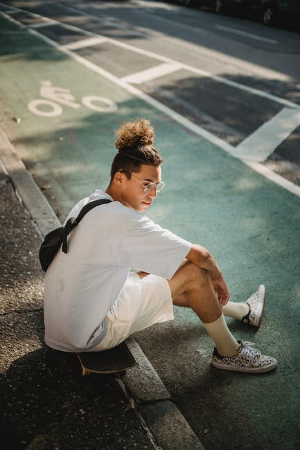 年轻种族男性溜冰者坐在人行道上的滑板 · 免费素材图片