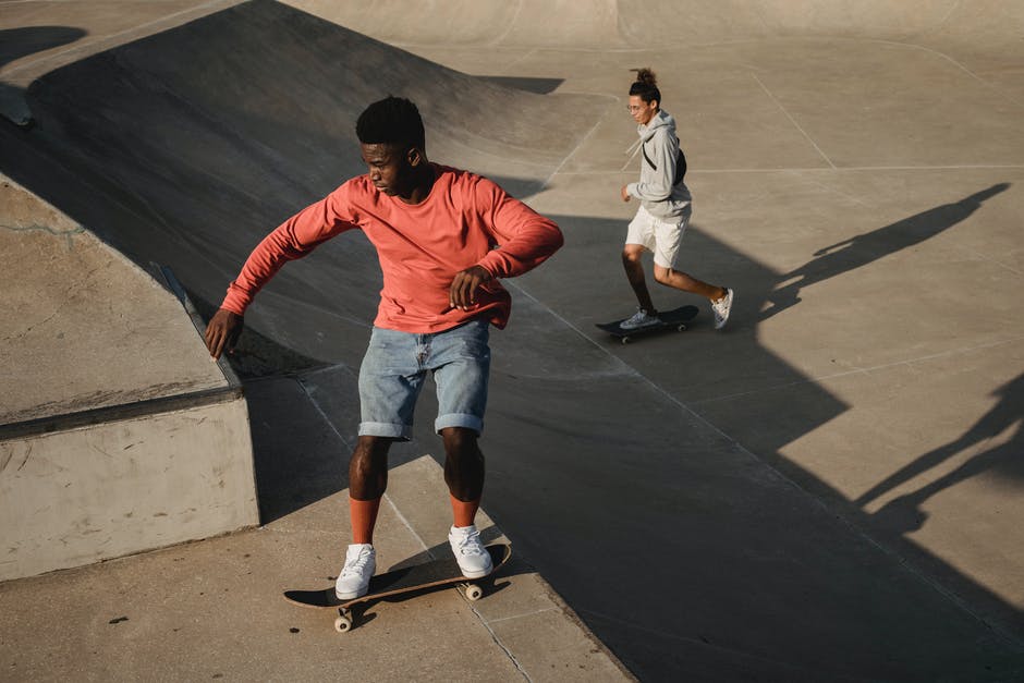 年轻人在阳光下在斜坡上整理滑板特技 · 免费素材图片