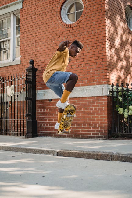 运动型黑色溜冰者在滑板上表演技巧 · 免费素材图片