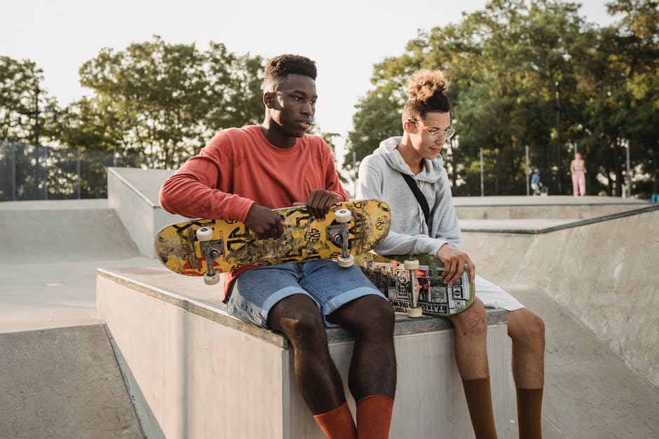 在滑板公园的平台上休息的多种族滑板手 · 免费素材图片