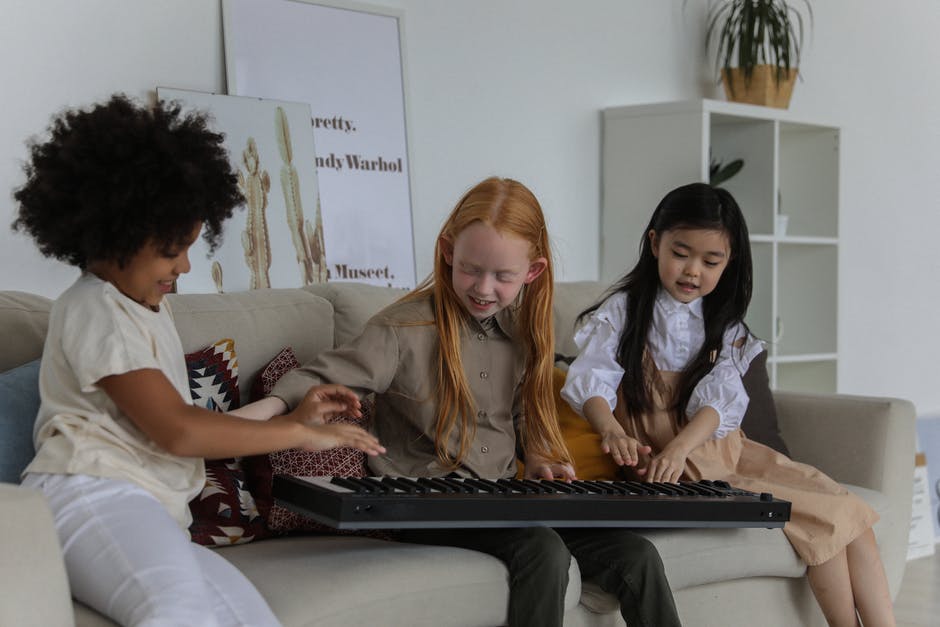 演奏合成器的愉快的多种族小女孩 · 免费素材图片