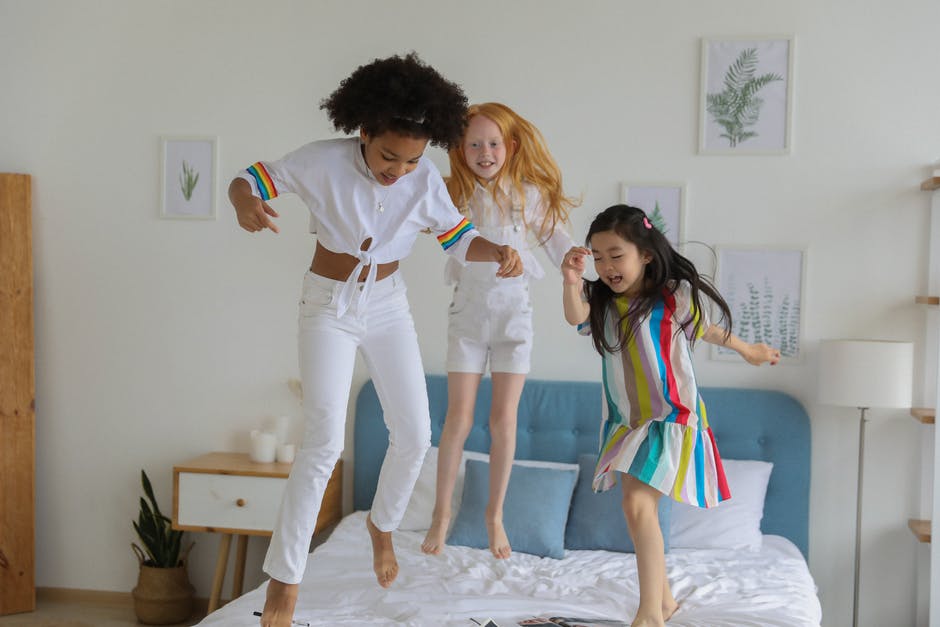 快乐的多样化女孩在跳跃在床上的休闲装 · 免费素材图片