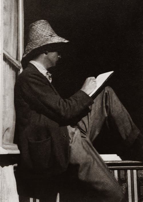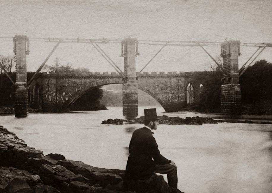 戴着帽子和西装坐在桥边河边的灰度照片男子 · 免费素材图片