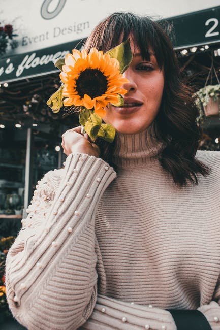 选择性焦点摄影的女人穿着灰色毛衣,靠近她的脸捧着黄色的向日葵 · 免费素材图片