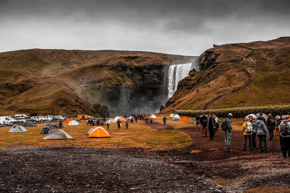 站在瀑布附近的露营地上的人 · 免费素材图片
