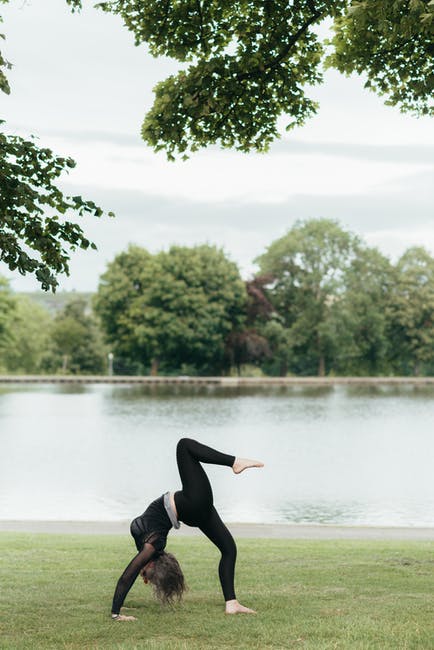 无法识别的女人在河岸边表演一个腿轮姿势 · 免费素材图片