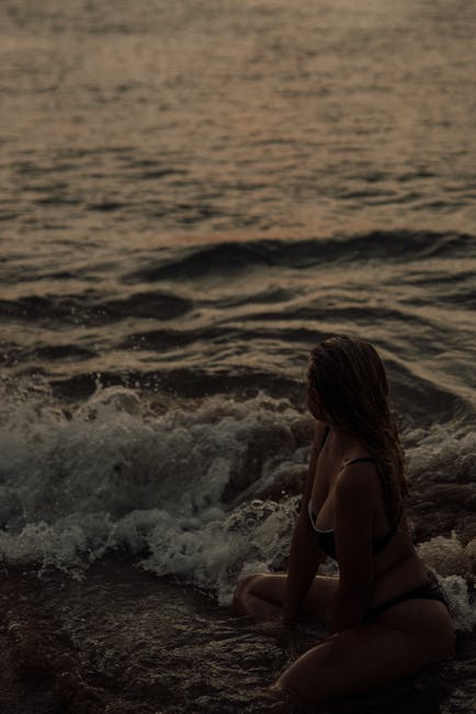 黑色比基尼坐在日落海滩上的女人 · 免费素材图片