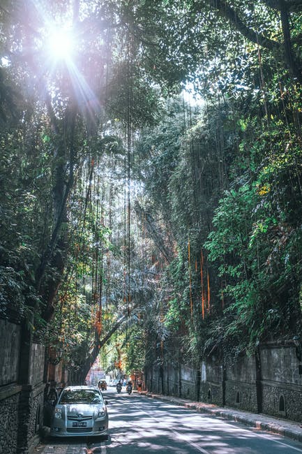 沥青路面与摩托车和绿枝下的停放的汽车 · 免费素材图片