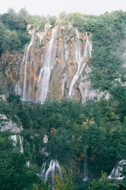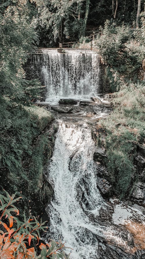 如诗如画的瀑布流淌在岩石深谷的绿色茂密森林中 · 免费素材图片