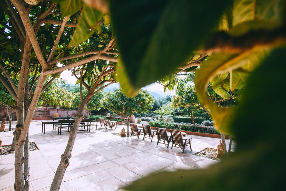在郁郁葱葱的绿色树木的平铺人行道上的家具 · 免费素材图片