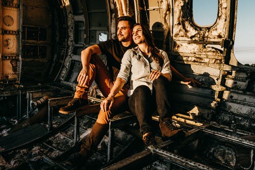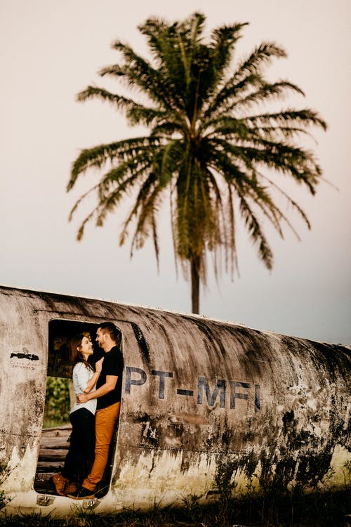 匿名夫妇在坠毁的飞机上拥抱着闪亮的灯光 · 免费素材图片