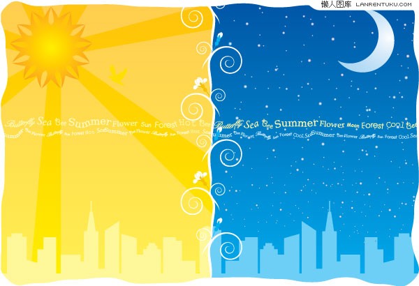 带有卡通色彩的黑夜白昼城市剪影插画矢量素材