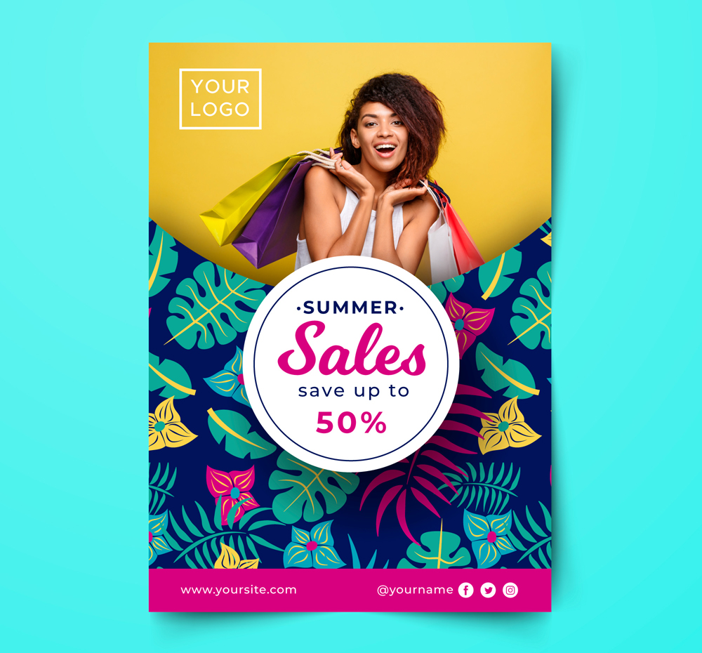 时尚女子夏季半价促销传单矢量图