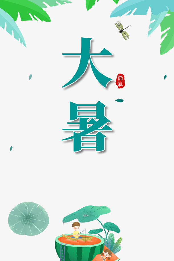 大暑夏天西瓜荷叶树叶手绘人物蜻蜓