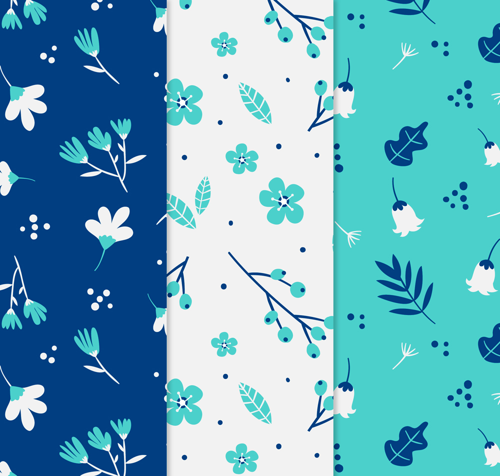 3款蓝色和绿色花卉树叶无缝背景矢量图