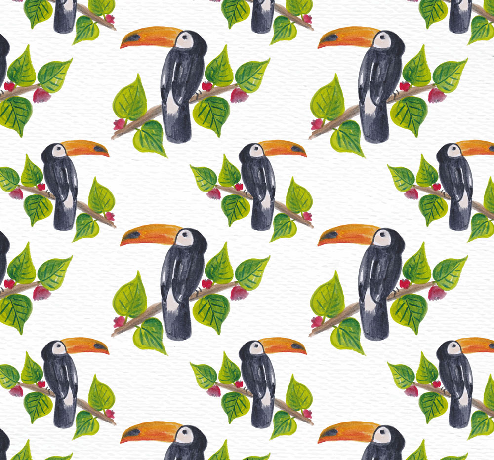 彩绘树枝上的托哥巨嘴鸟无缝背景矢量图