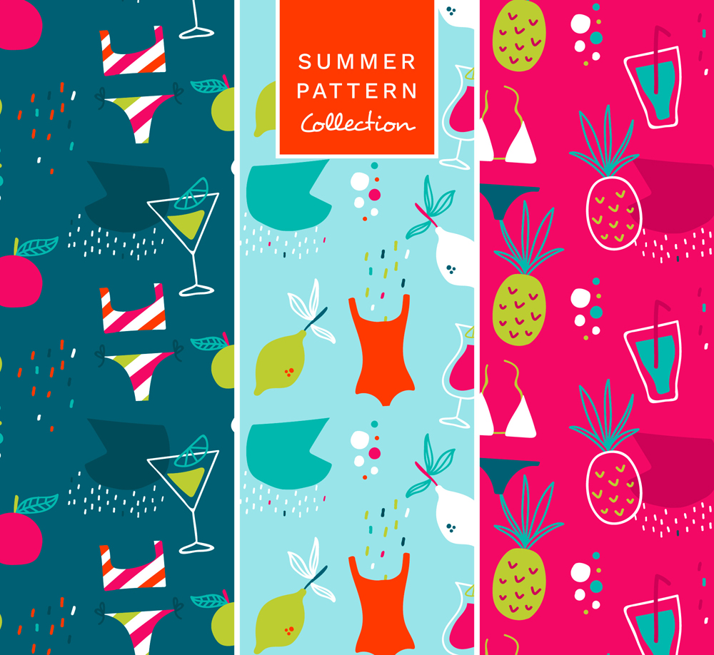 3款彩色手绘夏季度假元素无缝背景矢量图