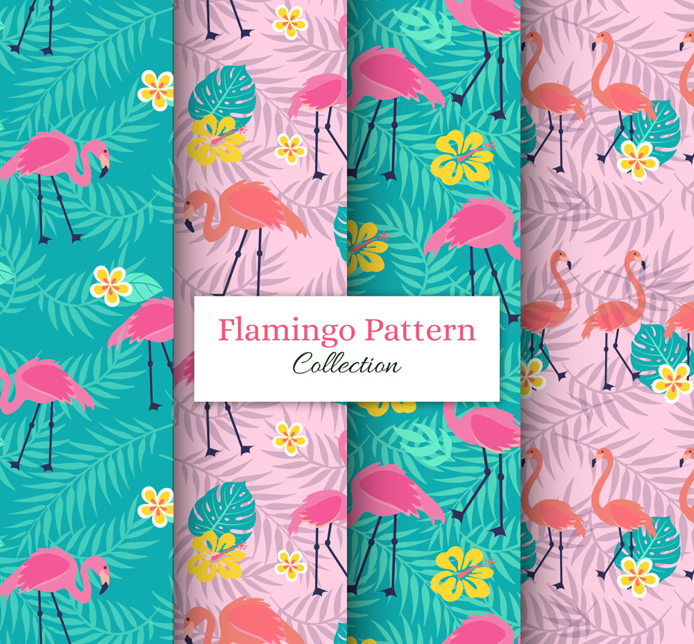4款创意火烈鸟和棕榈树叶无缝背景矢量图