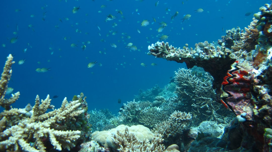 珊瑚礁上方水下游动的鱼群