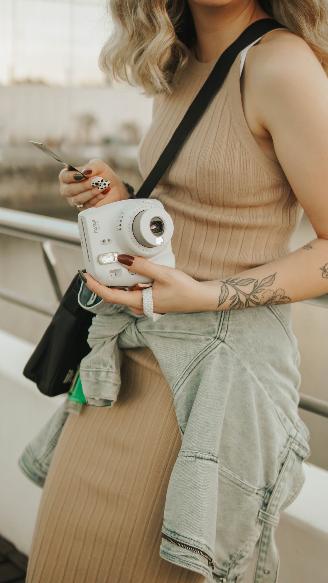 一位身穿棕色背心和灰色牛仔短裤、手持白点相机的女士
