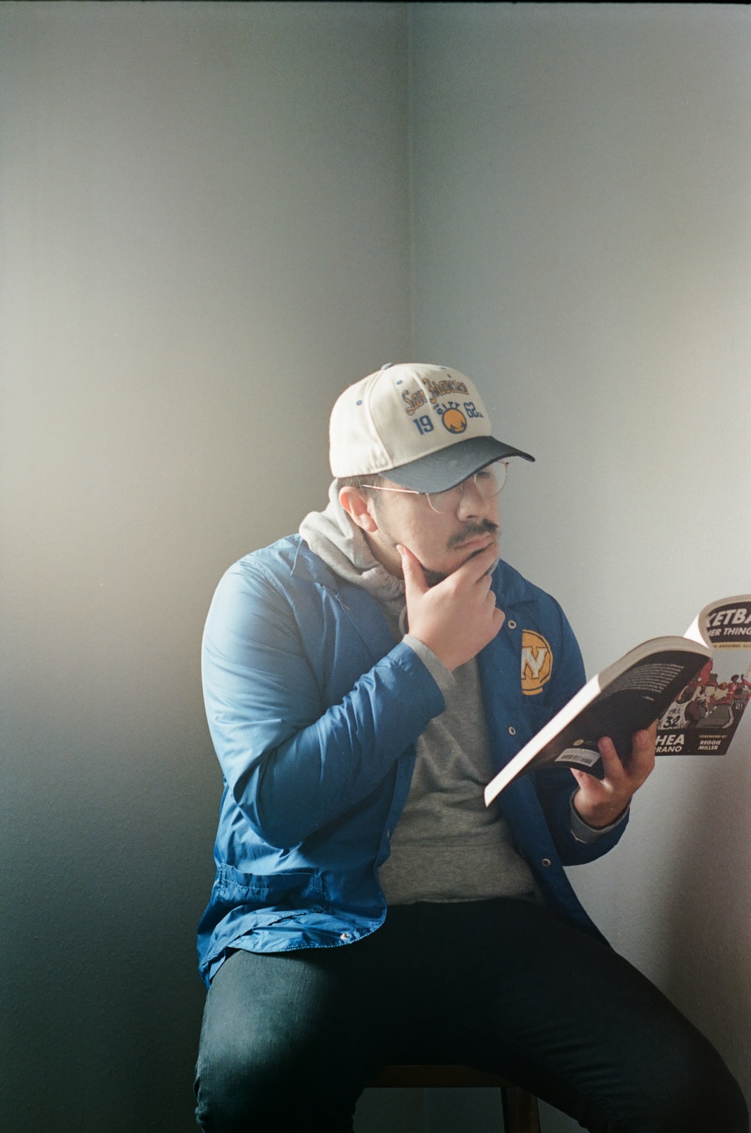 穿着灰色连帽衫和蓝色裤子坐在灰色沙发上的男人