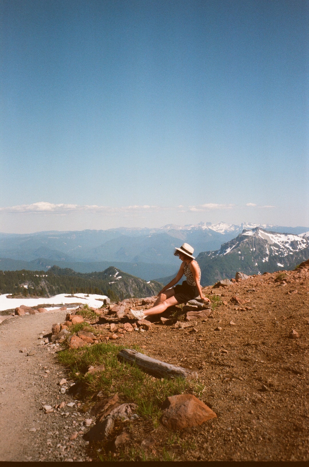 黑色t恤的男子坐在棕色岩石白天湖附近
