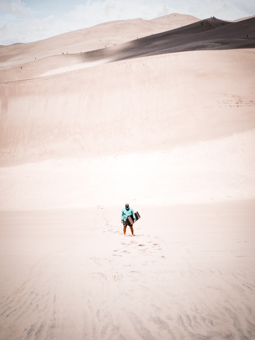 白天穿着蓝色衬衫和黑色裤子在白色沙滩上行走的人