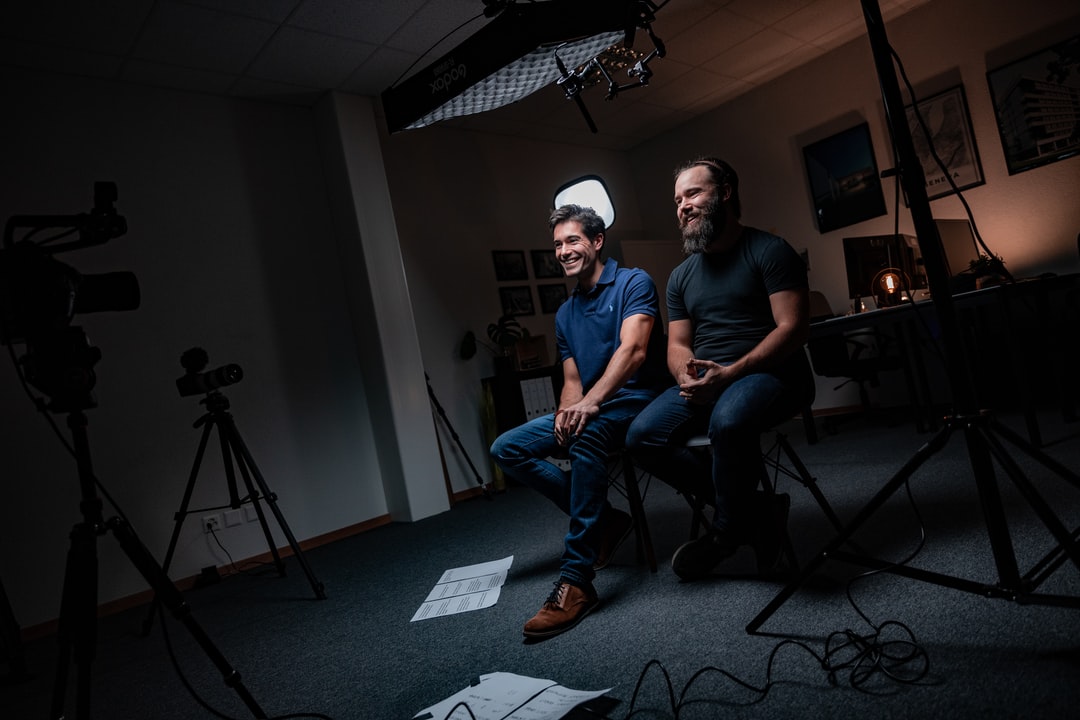 蓝色的水手领t恤的男子坐在黑色办公椅
