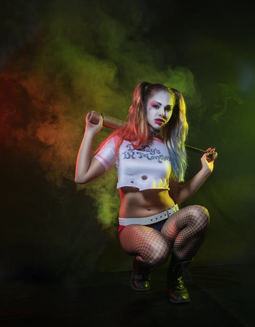 身穿白色背心和黑色牛仔短裤,手持棕色木棍的女士
