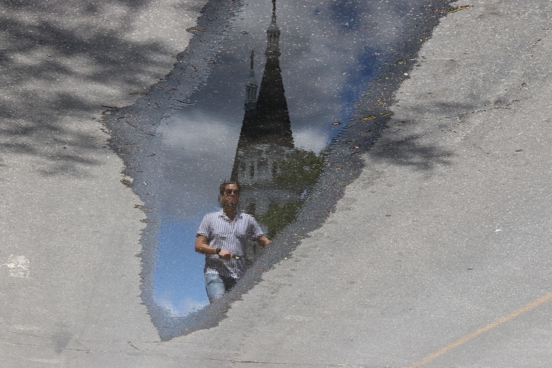 Dressed in blue and white striped polo unlined upper garment of man sitting on a gray cement floor surface