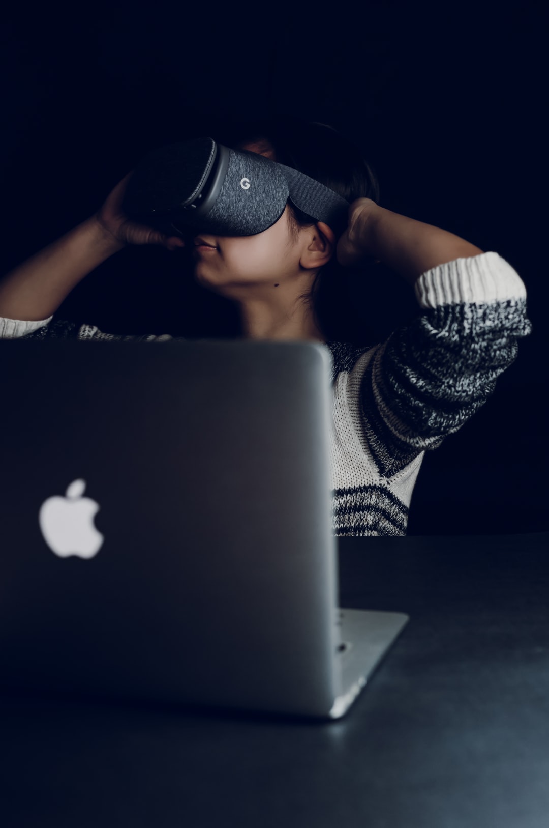 戴着黑色虚拟现实耳机的女士面朝MacBook