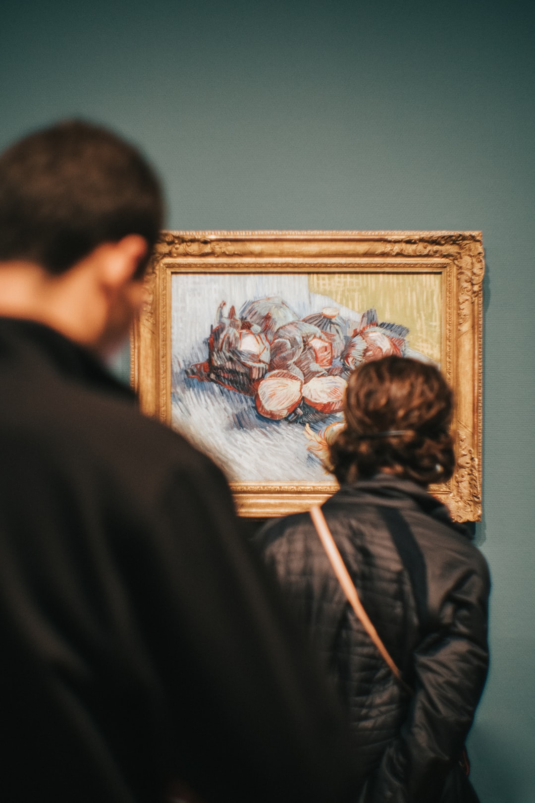 兩個人站著看文森特·梵高的《紅捲心菜和洋蔥的靜物畫》