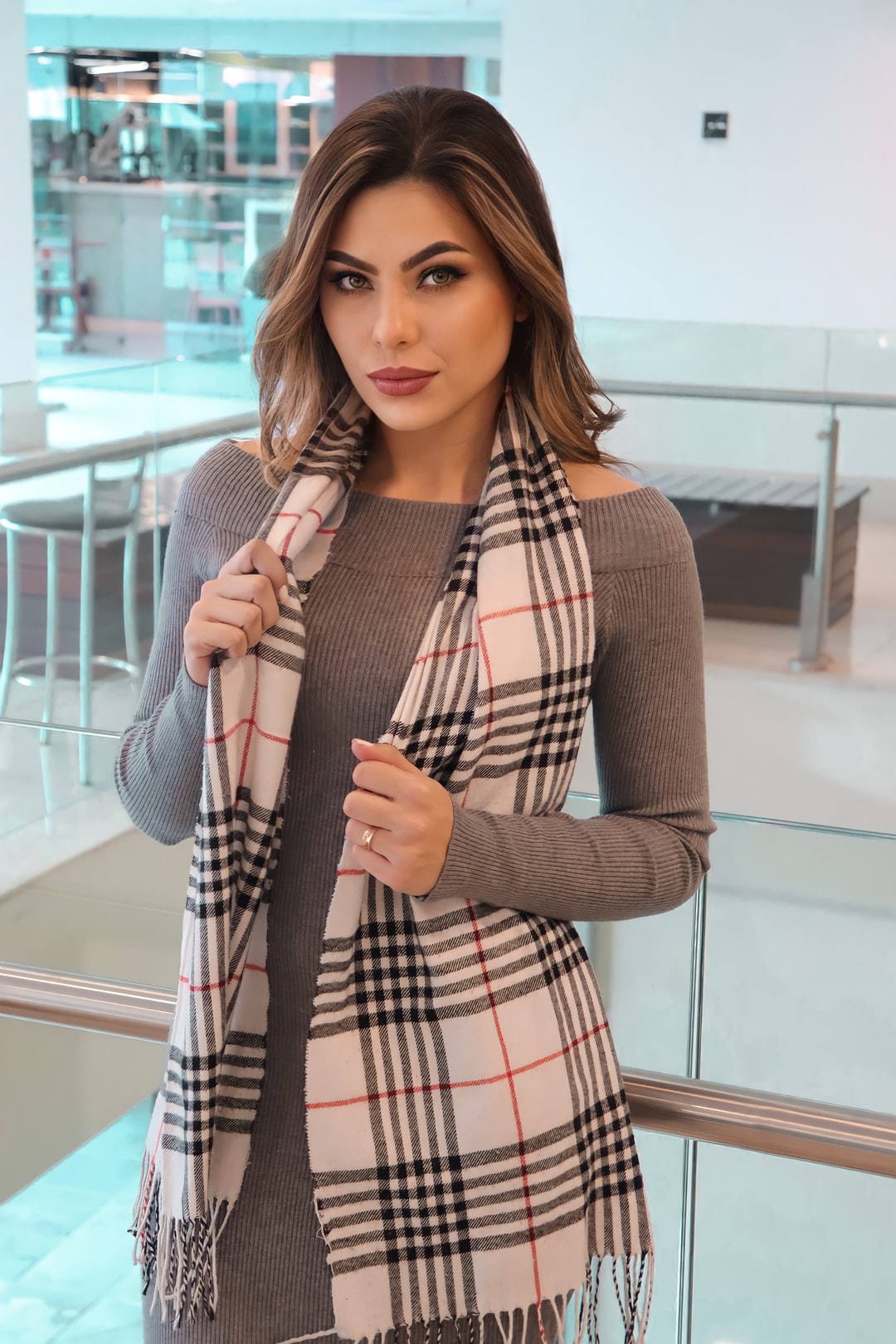 身穿棕色开襟羊毛衫和红白格子裙的女士