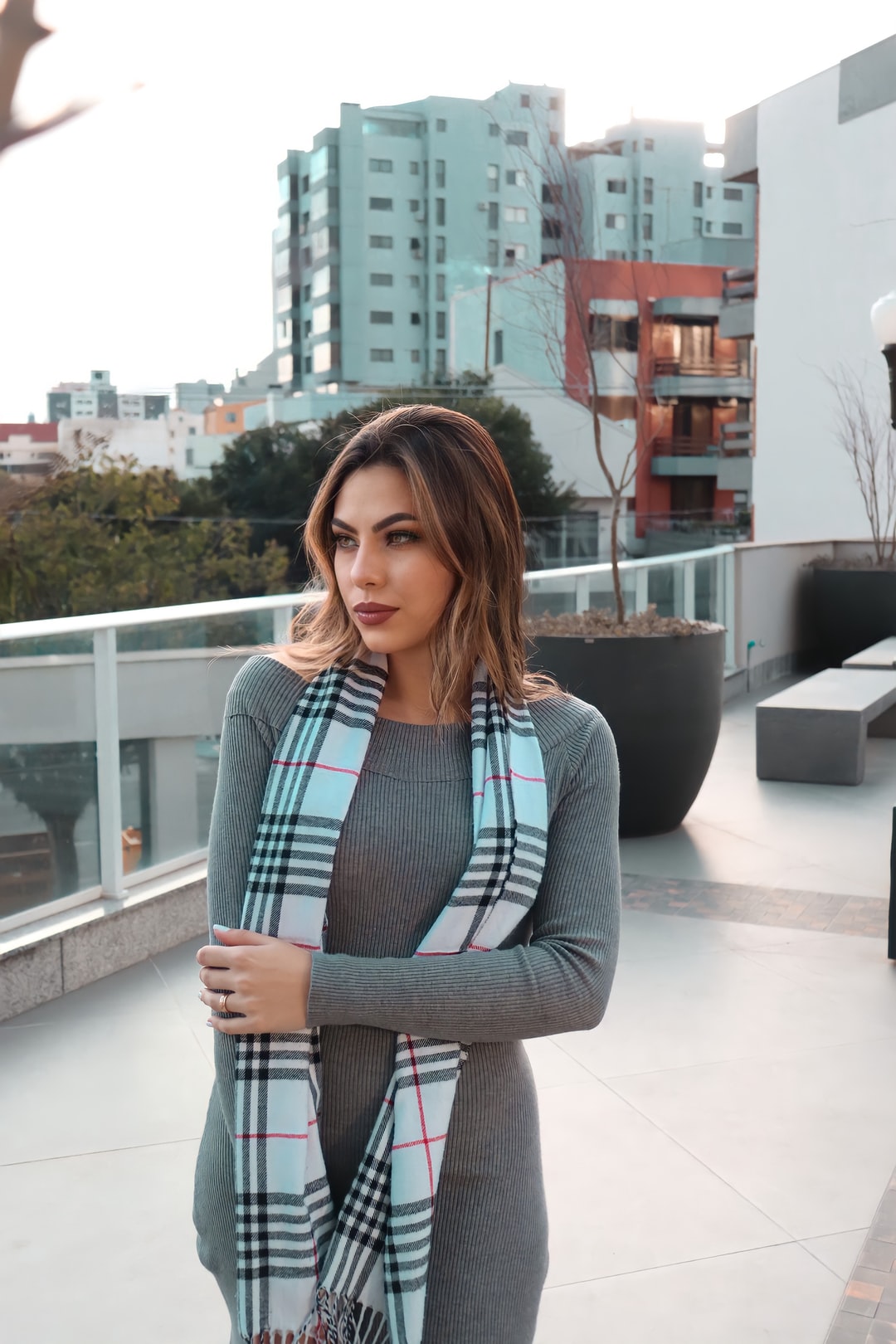 白天,一名身穿灰色羊毛衫的妇女站在灰色混凝土墙附近