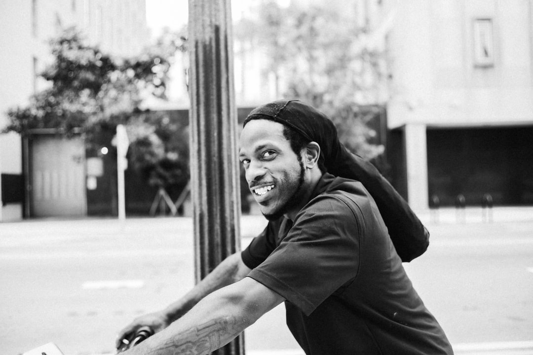 穿长袖衬衫的女人靠在金属柱上的灰度照片