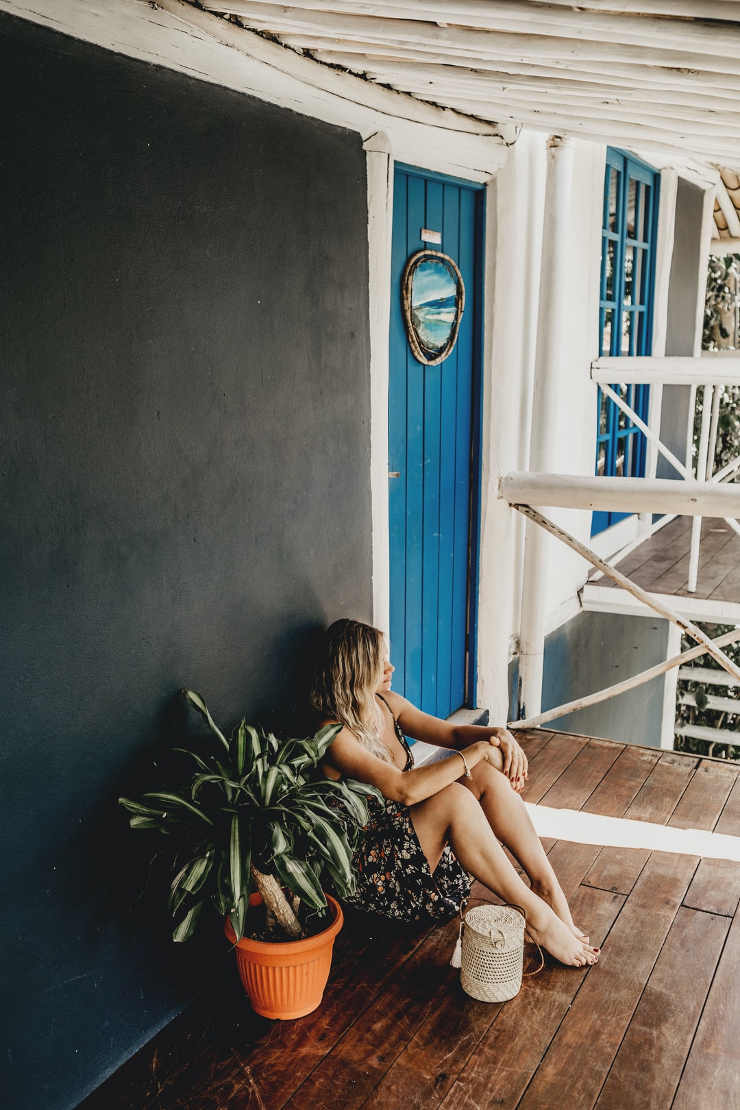 女人坐在棕色的木质走廊地板上