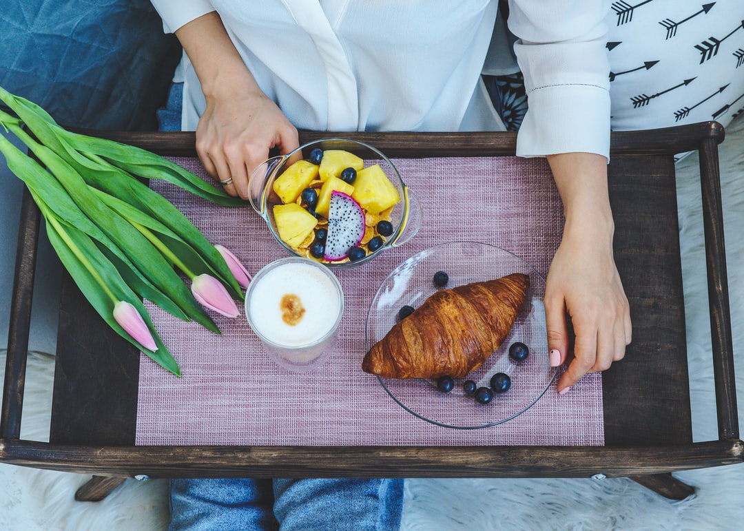 flat-lay摄影的羊角面包玻璃板旁边一杯牛奶