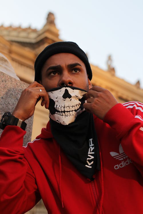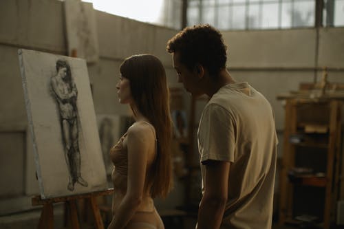 一对脸上涂着油漆的男人和女人站在白墙旁边